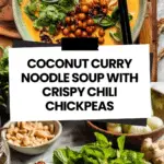 This vibrant 30 Minute Coconut Curry Noodle Soup with Chili Crisp Chickpeas is a flavorful and comforting meal that combines creamy coconut curry broth, tender noodles, and crispy, spicy chickpeas. The soup features a rich blend of Thai red curry paste, coconut milk, peanut butter, and fresh herbs, while oven-roasted chickpeas tossed in chili oil provide a delightful crunch and heat. Ready in just half an hour, this dish is perfect for a quick weeknight dinner bursting with texture and bold flavors.