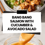 Experience a flavorful and easy weeknight dinner with this Bang Bang Salmon recipe. Featuring tender salmon cubes coated in a spicy, tangy bang bang sauce, complemented by a refreshing cucumber and avocado salad, and served with steamed jasmine rice. Ready in just 30 minutes using simple pantry ingredients and either an air fryer, stovetop, or oven.