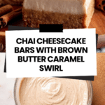 These silky smooth spiced chai cheesecake bars feature a rich brown butter graham cracker crust, topped with a luscious brown butter cream cheese frosting and a decadent brown sugar chai caramel swirl. Infused with aromatic chai spices like cinnamon, cardamom, and ginger, these bars capture the essence of autumn in every bite with a perfect creamy texture and warming flavors.