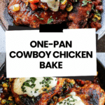 Cowboy Chicken is a hearty, flavor-packed baked chicken dish featuring juicy chicken breasts seasoned with smoky spices, then smothered in fire-roasted tomatoes, black beans, corn, green chiles, and topped with melted pepper jack cheese. It’s an easy, family-friendly dinner that comes together in one skillet.