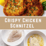 This Chicken Schnitzel recipe features tenderized, breaded chicken breasts that are pan-fried to a crispy, golden perfection. Flavored with garlic, parsley, and Parmesan, these schnitzels are served with a fresh squeeze of lemon for a delightful and classic dish perfect for a satisfying dinner.