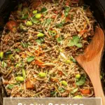 After the slow cook time is up, remove the lid and gently stir in the frozen edamame, a delightful green touch that adds a lovely pop of texture and protein. Nestle the ramen noodle cakes directly into the sauce – don’t worry if they don’t fully submerge, spooning some of the meat and veggie mixture on top helps the noodles soak in that rich broth. Then cover and cook on high for another 15 to 30 minutes, stirring occasionally to prevent sticking and ensure the noodles cook evenly until tender and perfectly chewy.