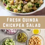- Prepare the Salad Ingredients: While the quinoa cools, chop 1/2 cup pistachios, 1/2 cup parsley, 1/2 cup mint, 1 cup cucumber, and 1/3 cup red onion. Drain and rinse 15 oz of chickpeas and crumble 1/2 cup feta cheese.