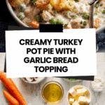 This Garlic Bread Leftover Turkey Pot Pie is a comforting twist on traditional pot pie, transforming dry leftover turkey into a creamy, flavorful dish topped with a buttery, garlicky cheesy bread layer. Blending the creamy turkey filling with a crispy garlic bread topping, it’s perfect for repurposing leftovers into a hearty American-style dinner.