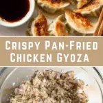 Delicious homemade Japanese Gyoza, also known as potstickers, featuring a savory ground chicken and vegetable filling wrapped in thin gyoza wrappers, pan-fried to crispy perfection and steamed for a tender interior. Perfect appetizer or snack served with soy sauce and rice vinegar dipping sauces.