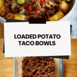 This Loaded Potato Taco Bowl recipe combines crispy oven-baked or air-fried potatoes with a savory spiced ground beef topping, creamy homemade guacamole, fresh salsa, and a generous sprinkle of Mexican cheese blend, creating a hearty and flavorful meal perfect for any occasion.