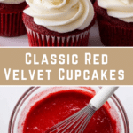 Delicious and moist Red Velvet Cupcakes topped with creamy, tangy cream cheese frosting. This recipe offers two options: a fully homemade version or an enhanced box mix alternative, ensuring perfect cupcakes every time. The cupcakes feature a tender crumb with just the right hint of cocoa and vibrant red color, balanced by the luscious cream cheese frosting that’s velvety smooth and sweetly spiced with vanilla.