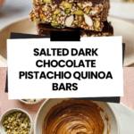 These Salted Dark Chocolate Pistachio Quinoa Crunch Bars are a deliciously crunchy, nutrient-packed snack perfect for satisfying your sweet tooth while keeping it wholesome. Featuring toasted quinoa, gluten-free oats, and rich almond butter, these bars are topped with a smooth layer of dark chocolate, sprinkled with crunchy pistachios and a pinch of sea salt, creating a perfect balance of sweet and savory flavors.
