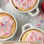 A white rectangular dish with two handles holds a soft yellow cake with a visible thin layer of pink filling inside, topped with smooth pink icing spread unevenly, decorated with small round and thin sprinkles in pastel colors like lavender, pink, and light blue; part of the cake is missing, showing its moist texture. Nearby, a white ramekin contains the same cake topped with the same icing and sprinkles, and behind the dish is a large fresh red strawberry. A shiny gold spoon and scattered sprinkles are on a white marbled surface. Photo taken with an iphone --ar 4:5 --v 7