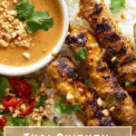Delicious Thai Chicken Satay Skewers marinated in a flavorful blend of curry powder, red curry paste, and coconut milk, grilled to perfection and served with a rich, creamy Thai Peanut Sauce. This dish is perfect as a starter or main course and pairs wonderfully with jasmine or Thai fried rice.