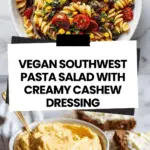A vibrant and flavorful Vegan Southwest Pasta Salad featuring whole wheat pasta, black beans, fire-roasted corn, tomatoes, bell peppers, red onion, and fresh cilantro, all tossed in a creamy, smoky cashew-based Southwest dressing. This easy, make-ahead pasta salad is perfect for summer parties, quick dinners, or potlucks, offering a healthy, protein-rich, and refreshing dish with bold, southwestern flair.