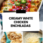 These White Chicken Enchiladas feature tender shredded chicken mixed with a creamy, flavorful sauce made with a blend of spices, green chiles, and cheeses. Rolled into flour tortillas and baked to perfection, they offer a delightful mix of gooey, cheesy goodness and zesty toppings like fresh tomatoes, onions, jalapenos, and cilantro. Perfect for a comforting dinner that brings a fresh twist on classic enchiladas.